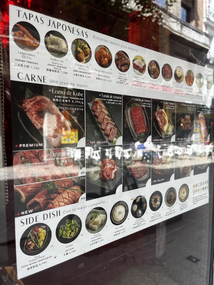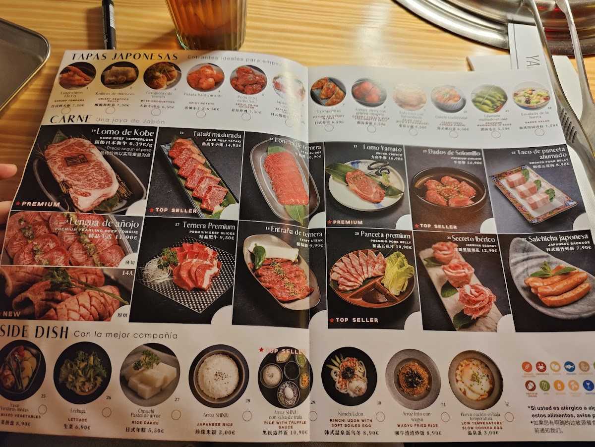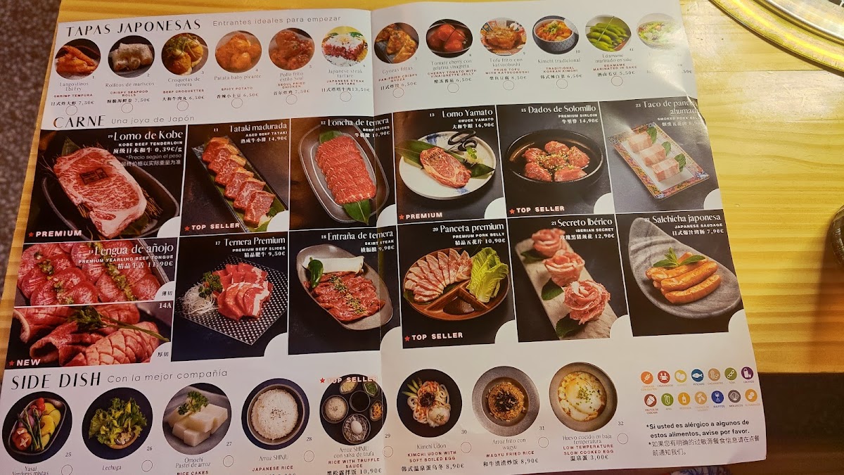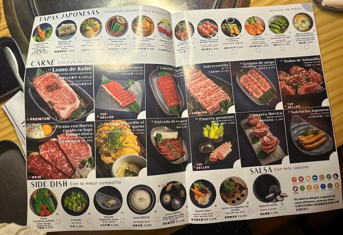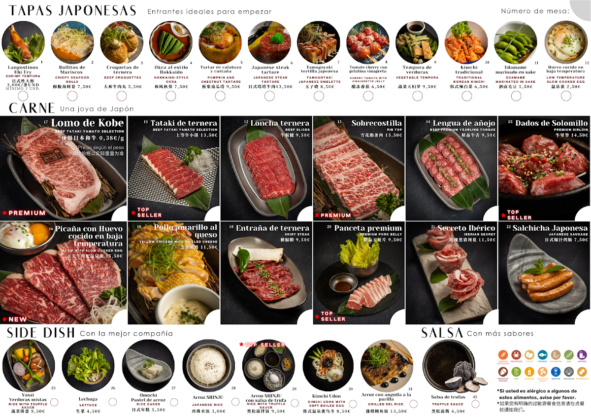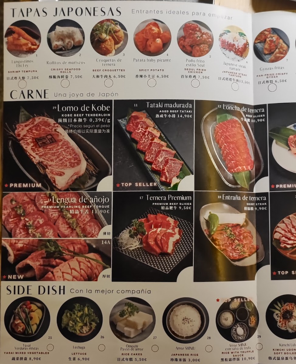 Acompañantes / Side Dishes: To accompany the grilled meats, a selection of sides is available such as Wagyu butter fried rice, plain Japanese rice, rice with truffle sauce, kimchi udon with soft boiled egg, lettuce, rice cakes, truffle sauce, and mixed vegetables. These provide complementary flavors and textures to the main dishes.